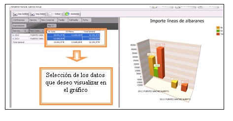 Para visualizar los datos en el gráfico, simplemente tendremos que hacer click sobre las distintas celdas que contienen los valores, directamente se verán reflejadas en el gráfico. Podemos usar junto con el ratón las teclas de Control o Shift (mayúsculas temporales) para seleccionar diversas filas y/o columnas a nuestro interés