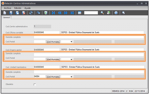 Es muy importante que se rellene la información de los domicilios de las tres unidades organizativas, ya que son datos obligatorios para el envío de la FacturaE a los organismos públicos.