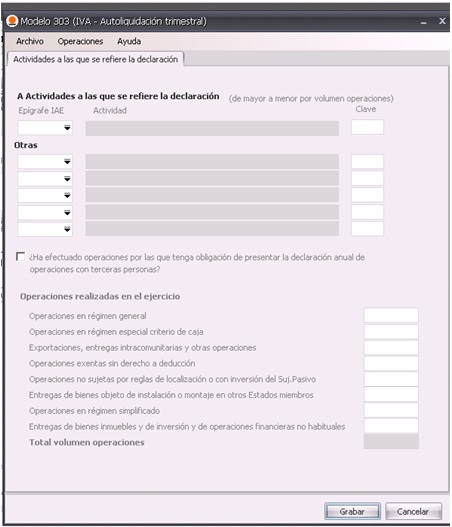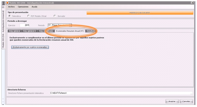 Si nos vamos a Modelos Oficiales ⇒ IVA ⇒ Modelo 303, tendremos que rellenar la siguiente pestaña si estamos exonerados.