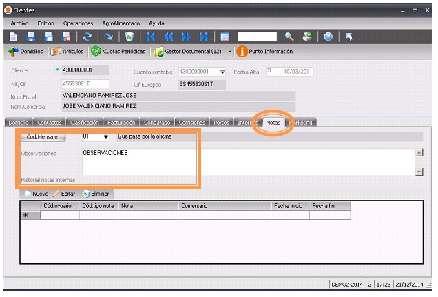 Para ello, tendremos que irnos a la pestaña de Notas, e informar el “Cód. Mensajes” que previamente ya tendremos dados de alta.