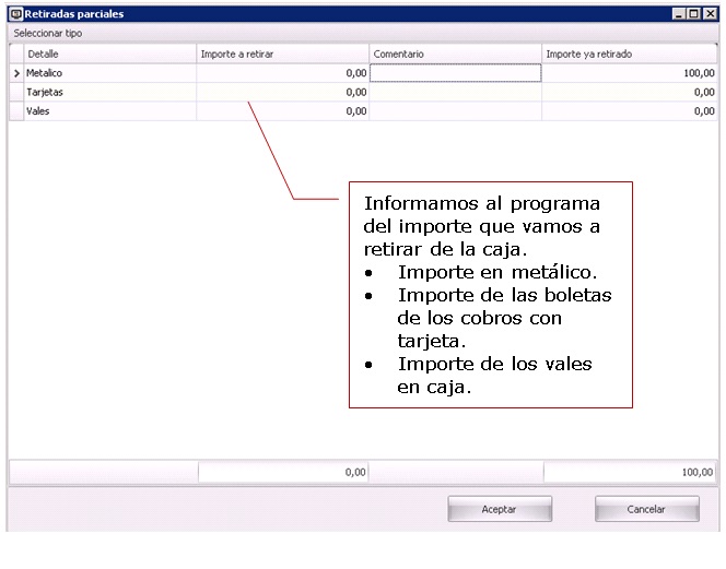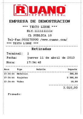 Cada vez que se produzca un reintegro de la caja, tanto de boletas, efectivo o vales el programa emite un justificante de entrega.