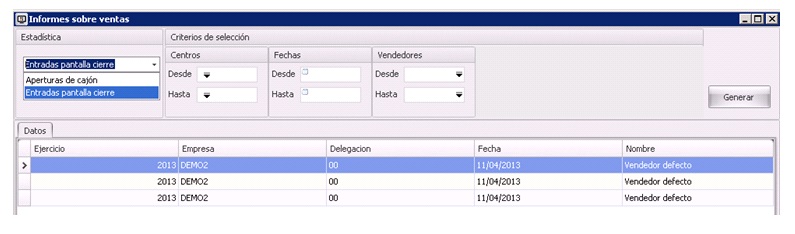 Esta ventana nos permite conocer el número de aperturas del cajón y el número de entradas en la pantalla de cierre.
