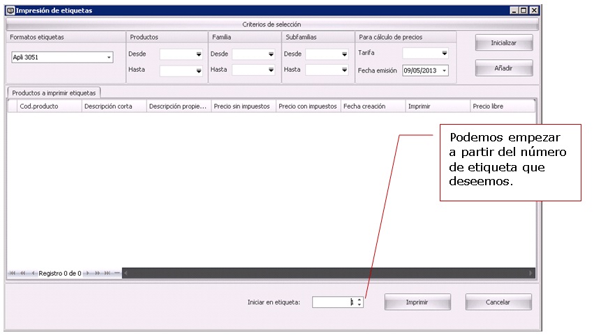 Nuevas funcionalidades en la pantalla de impresión de etiquetas de artículos para poder evitar el imprimir ciertos artículos de las etiquetas, además de indicar la primera posición a imprimir.