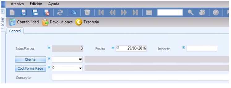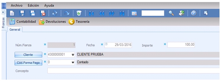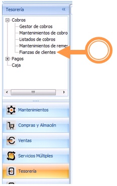 Cuando recibimos la fianza de un cliente, debemos darla de alta a través de Tesorería/Cobros/Fianzas de clientes: