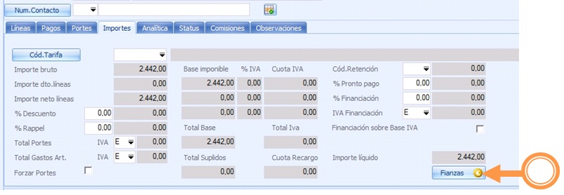 Para ello, cuando creemos un pedido o albarán, en la pestaña importes tendremos la opción de gestionar fianzas: