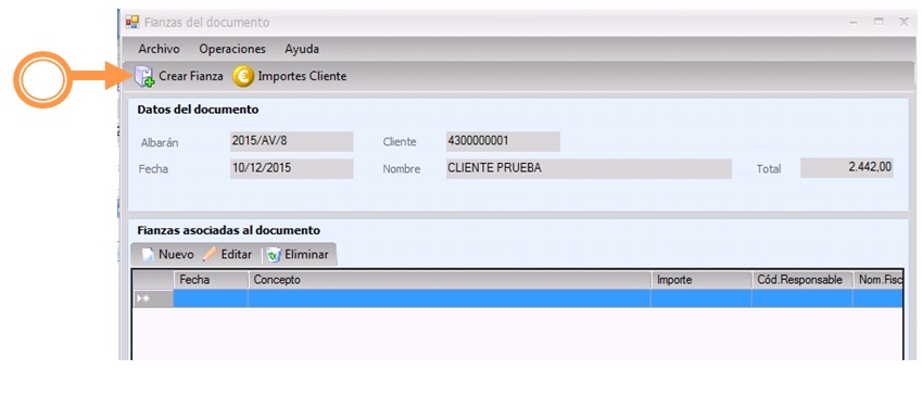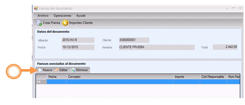 3. Asociar una fianza a este documento dándole al botón de nuevo: