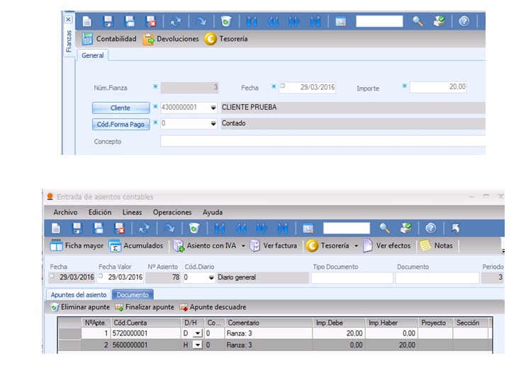 Indicando fecha, importe, cliente, forma de pago y concepto. En ese caso, las únicas formas aceptadas de devolución de fianzas son contado y tarjeta. Al guardar, generamos un asiento contable que podremos consultar en el botón de Contabilidad: