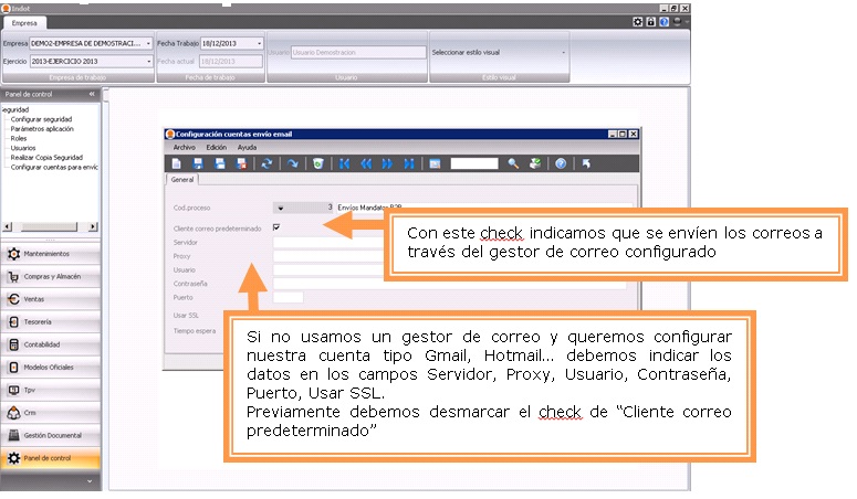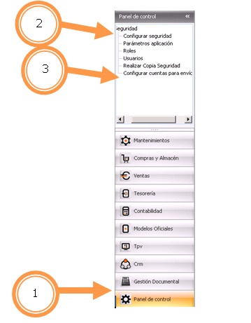 Para ir a la configuración, pulsamos en el menú lateral izquierdo, el botón Panel de Control (Imagen Punto 1)->después le damos Seguridad (Imagen Punto 2)-> Configurar cuentas para envío email (Imagen Punto 3).