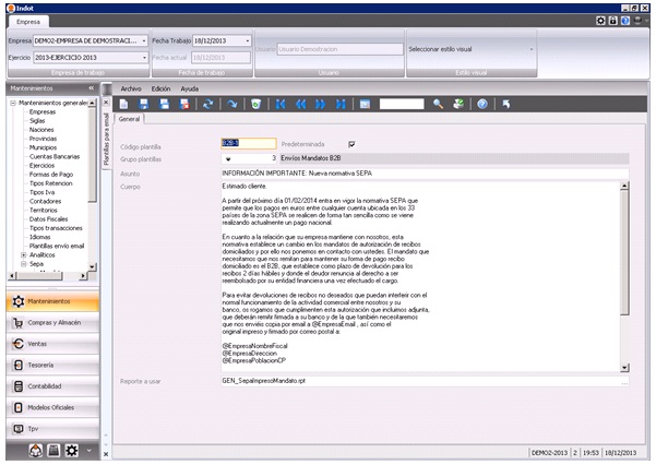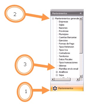 Indot tiene creado un formato de plantilla estándar cada tipo de mandato. Estas plantillas se localizan en Indot pulsando en el menú lateral izquierdo el botón Mantenimientos (Imagen Punto 1) ->después le damos Mantenimientos Generales (Imagen Punto 2)-> Plantillas envío email (Imagen Punto 3).