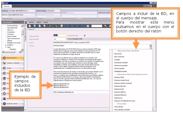 Si dentro del cuerpo del mensaje queremos incluir algún dato de la empresa activa o del cliente, a parte de los que vienen por defecto, por ejemplo el Nombre Comercial, en vez de escribirlo directamente a mano, podemos incluirlo de la BD de Indot, de forma que si en el mantenimiento de la empresa cambiamos ese dato, no tenemos que preocuparnos de actualizarlo en esta plantilla. El procedimiento es pulsar con el botón derecho en el cuerpo del mensaje, en la zona donde queremos añadir el texto, y nos salen los campos a incluir, hacemos click con el izquierdo en el nombre del campo. Se incluye en el cuerpo el nombre del campo precedido de una @.