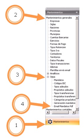 Para acceder a la pantalla en la que podremos seleccionar los clientes a los cuales vamos a enviar el mandato, pulsamos en el menú lateral izquierdo el botón Mantenimientos (Imagen Punto 1)->después le damos Mantenimientos Generales (Imagen Punto 2)-> Sepa (Imagen Punto 3)-> Email mandatos PDF (Imagen Punto 4).