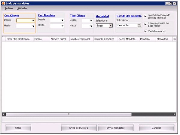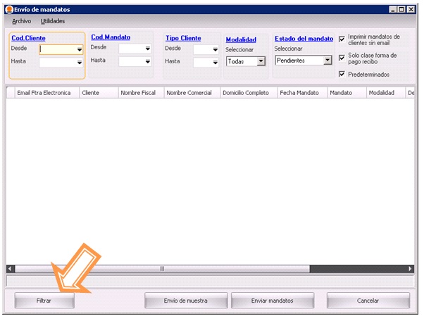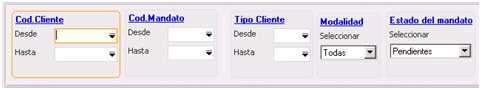 Podremos filtrar por códigos de clientes, por códigos de mandatos, por tipos de clientes, por modalidad del mandato o por estado del mandato.
