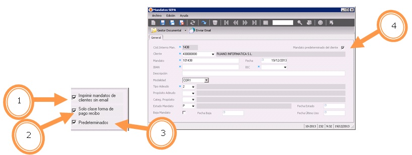 También tendremos la opción de indicar, si queremos que se impriman los mandatos de clientes que no tienen informado el email (Punto 1), enviar el mandato solo a los clientes que su forma de pago sea recibo (Punto 2), enviar el mandato que tienen marcado como predeterminado en la ficha de cliente (Puntos 3 y 4).