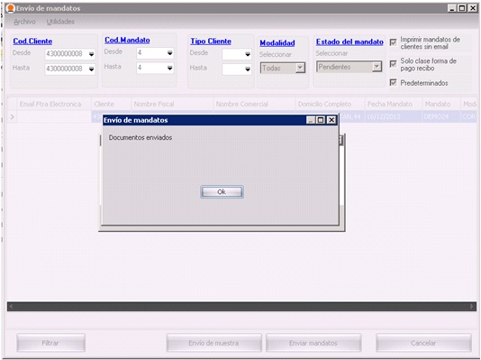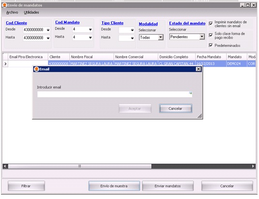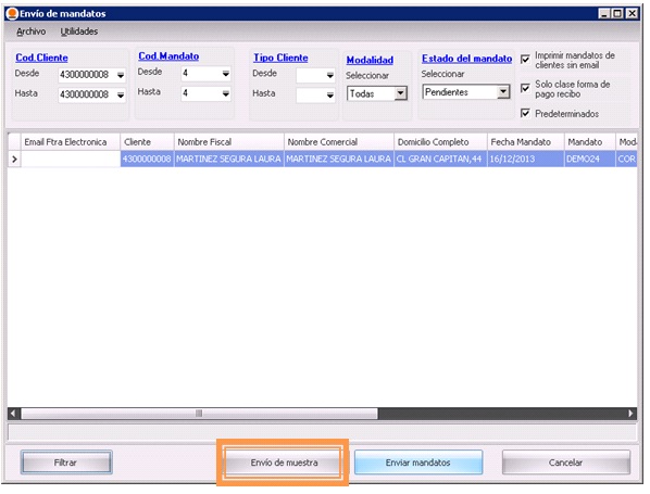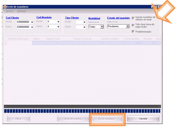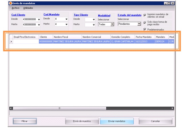Podremos enviar por email mandatos a todos los clientes que cumplan los requisitos del filtro indicado en la imagen siguiente.