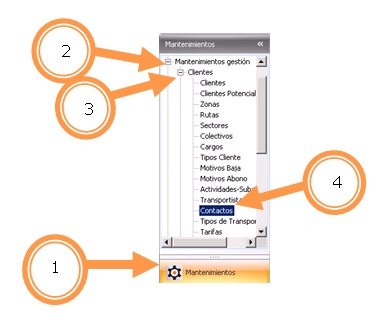 Accedemos al mantenimiento de contactos. Menú lateral izquierdo, botón Mantenimientos (Imagen punto 1) -> Mantenimientos de Gestión (Imagen punto 2) -> Clientes (Imagen Punto 3) -> Contactos (Imagen Punto 4).
