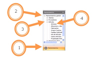 Accedemos al mantenimiento de artículos. Menú lateral izquierdo, botón Mantenimientos (Imagen punto 1) -> Mantenimientos de Gestión (Imagen punto 2) -> Artículos (Imagen Punto 3) -> Artículos (Imagen Punto 4).