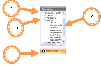 Accedemos al mantenimiento de artículos. Menú lateral izquierdo, botón Mantenimientos (Imagen punto 1) -> Mantenimientos de Gestión (Imagen punto 2) -> Artículos (Imagen Punto 3) -> Almacenes y Ubicaciones (Imagen Punto 4).