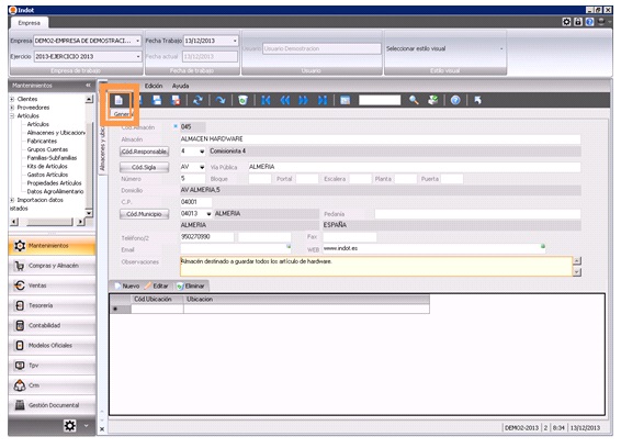 En primer lugar damos de alta el almacén. Par ello pulsamos el botón Nuevo e introducimos los datos.