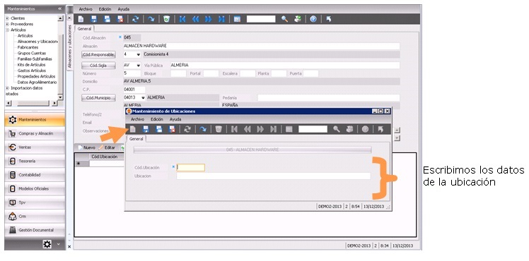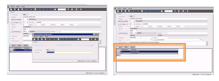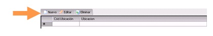 Se nos abre el mantenimiento de ubicaciones, para que indiquemos tanto el código como la descripción. Desde esta ventana crearemos tantas ubicaciones como necesitemos. El procedimiento es igual que siempre le damos a Nuevo, incluimos los datos y guardamos. Si necesitamos crear otra seguimos el mismo proceso. Una vez dadas de alta todas las ubicaciones cerramos esta ventana.