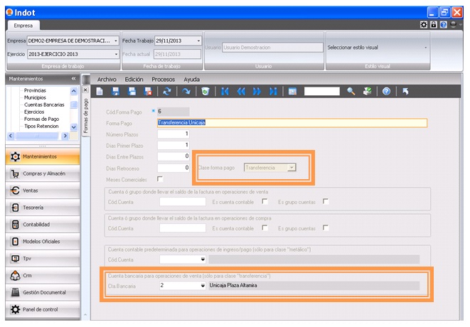 En el mantenimiento de formas de pago se ha integrado la cuenta bancaria para operaciones de venta (solo transferencia).