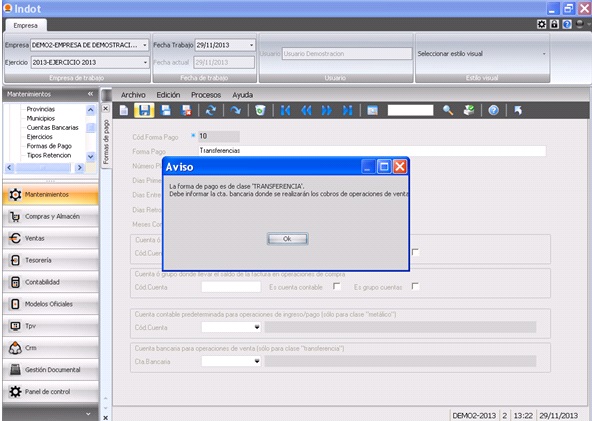 Este campo exclusivamente se rellena cuando la “Clase forma de pago” está seleccionado como transferencia. En el caso que no esté indicado nos saldrá un mensaje de aviso indicándonoslo.