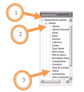 Accedemos al mantenimiento de comisionistas. Menú lateral izquierdo, botón Mantenimientos -> Mantenimientos de Gestión (Imagen punto 1) -> Clientes (Imagen Punto 2) -> Comisionistas (Imagen Punto 3).