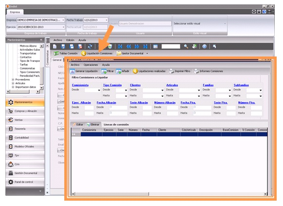 Le damos al botón de “Liquidación de Comisiones” y nos muestra la pantalla superpuesta que vemos en la imagen siguiente:
