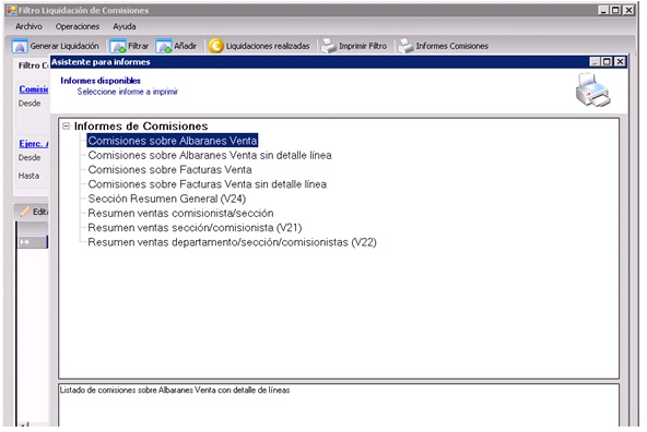 Al pulsar en el nos situamos en el asistente para informes de los comisionistas y el primero es el que en nuestro ejemplo queremos usar. Lo seleccionamos, ponemos los límites y ya elegimos si queremos verlo por pantalla o bien mandarlo a imprimir a la impresora.