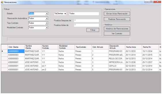Podremos filtrar por Estado: indicaremos aceptado, renovación automática, tipo de contratos, modalidad, cliente, desde una fecha determinada etc….