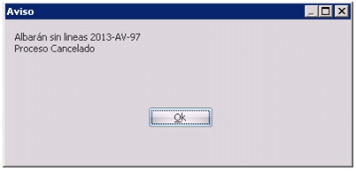 Si no creas al menos una línea con un artículo en el albarán de venta, no te permite facturarlo. Te sale un mensaje (como ves en la imagen siguiente) indicando que el albarán no tiene líneas y te cancela el proceso de facturación.