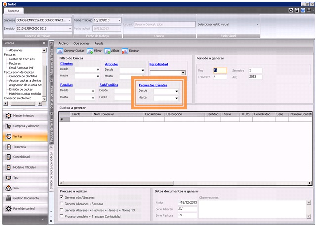 Se incluye la opción de poder filtrar por el código de proyecto del cliente para realizar la facturación de cuotas.