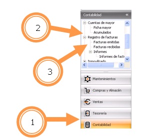 En el menú izquierdo seleccionamos “Contabilidad” (imagen punto 1) y dentro “Registro de Facturas” (pulsamos +) (imagen punto 2) -> “Facturas emitidas” (imagen punto 3).