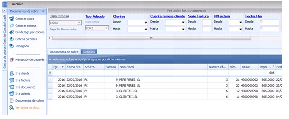 Para ello debemos tener información del importe o de la factura a la que corresponde, para poder localizarlo en nuestro gestor de cobros. Si el banco nos informa del importe, por ejemplo, 605 euros, podemos buscarlo en el gestor de cobros, en la opción “Ver todos los documentos”.