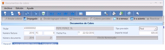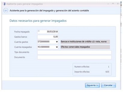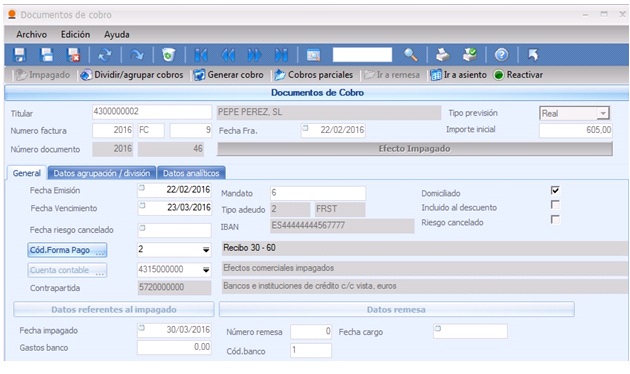 Se puede observar que aparecen los gastos bancarios de impagado, a título informativo, cuyo importe habremos informado cuando generamos el impagado.