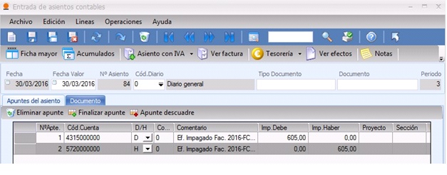 A la finalización del proceso, habremos generado un asiento contable donde recogemos el impago de la factura: