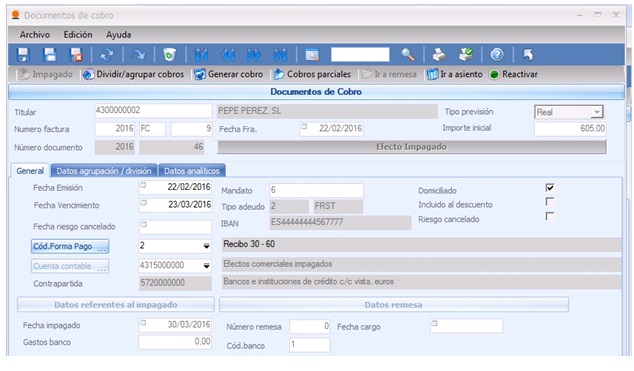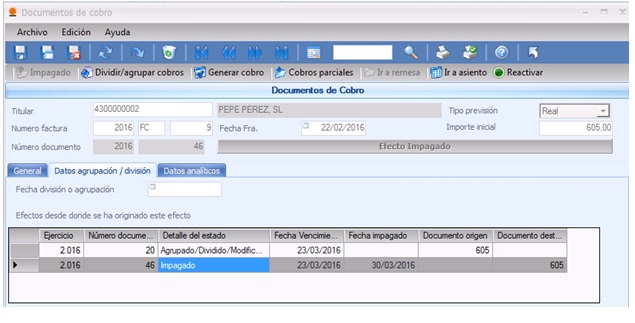 Se puede comprobar que el efecto original (nº 20) ha generado un nuevo documento (nº 46) que se puede consultar pulsando sobre la línea de “Impagado”: