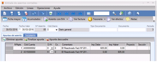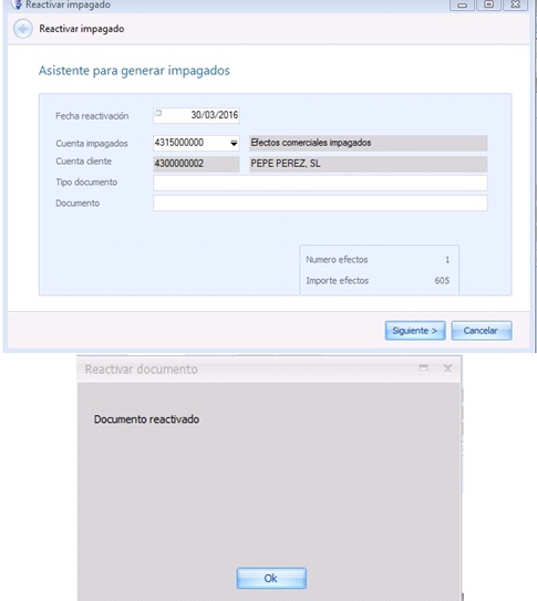 La principal consecuencia de la reactivación es que ese efecto deja de estar marcado como impagado; además, contablemente, se genera un asiento en el que anulamos la cuenta 4315 contra la del cliente 430, quedando desde ese momento un importe pendiente de pago por parte del mismo: