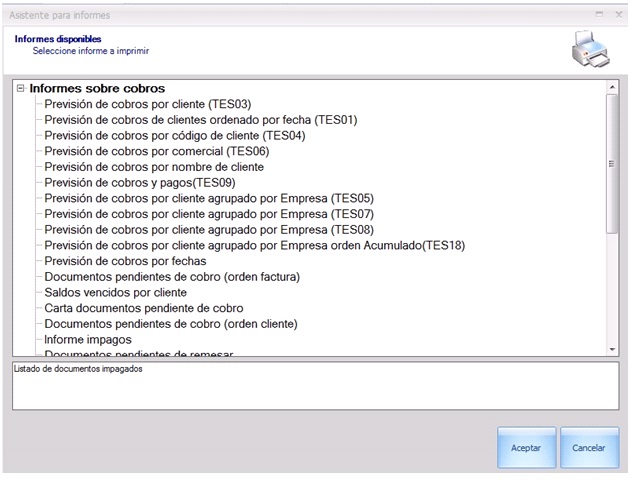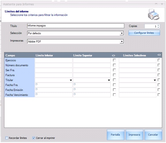 Y seleccionamos el Informe impagos, abriéndose un asistente para el informe: