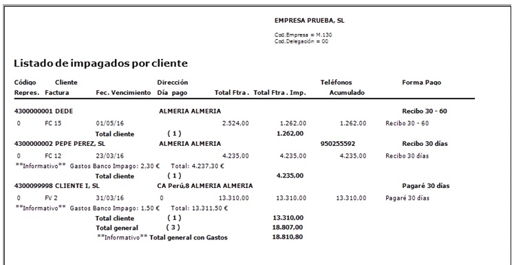 Hay que tener en cuenta que el mayor de la contabilidad del cliente en cuestión no va a recoger este impagado y la forma correcta de conocer el estado de las cuentas de nuestros clientes es a través de los listados del módulo de tesorería.