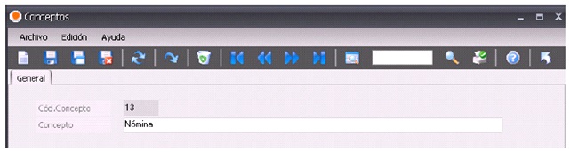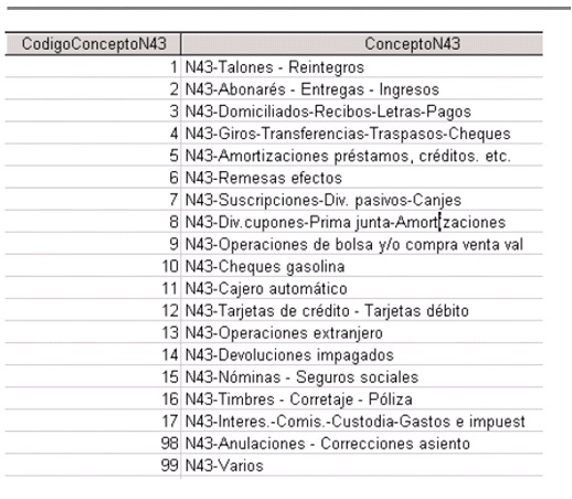 En éste mantenimiento se gestionan los conceptos utilizados por las entidades bancarias para codificar el concepto de los movimientos que suministran con los ficheros del tipo Norma 43.