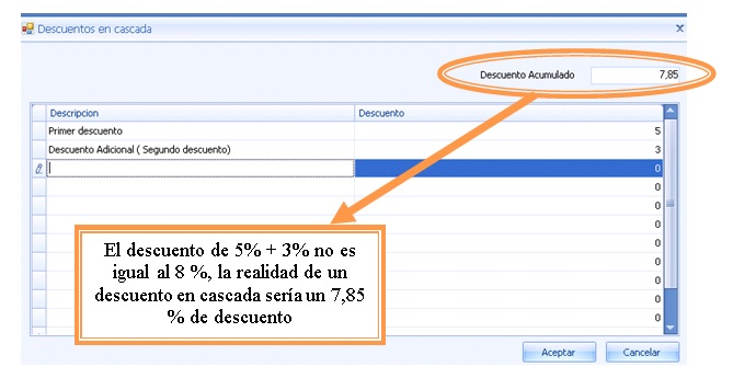 Para registrar esta operación en Indot, tendremos que realizar una venta como normalmente hacemos, y una vez situados en el campo de descuento pulsar F5 e introducir los descuentos en cascadas, tal cual como se muestra en la imagen.