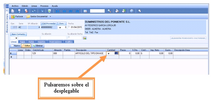 Por ejemplo, a la hora de seleccionar un artículo que tiene esta característica, cuando vamos a indicar la cantidad de artículos que deseamos, tendremos que pulsar el desplegable para que se nos muestre que envase es el que vamos a seleccionar.