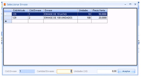 A continuación seleccionaremos el envase deseado y la cantidad de envases, y pulsaremos el icono de Aceptar.